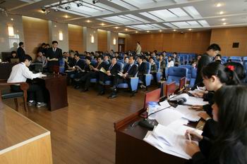 10月29日上午,教育部本科教学工作水平评估专家组张文显、樊丽明、刘灿、孙玉华、王立民、陈田初、陆靖、李克安、蒋晓丽、方鸿琴、马丹一行来到我校明法楼模拟法庭教室,分别视察了民商经济法学院和国际经济法学院组织的模拟法庭活动。
