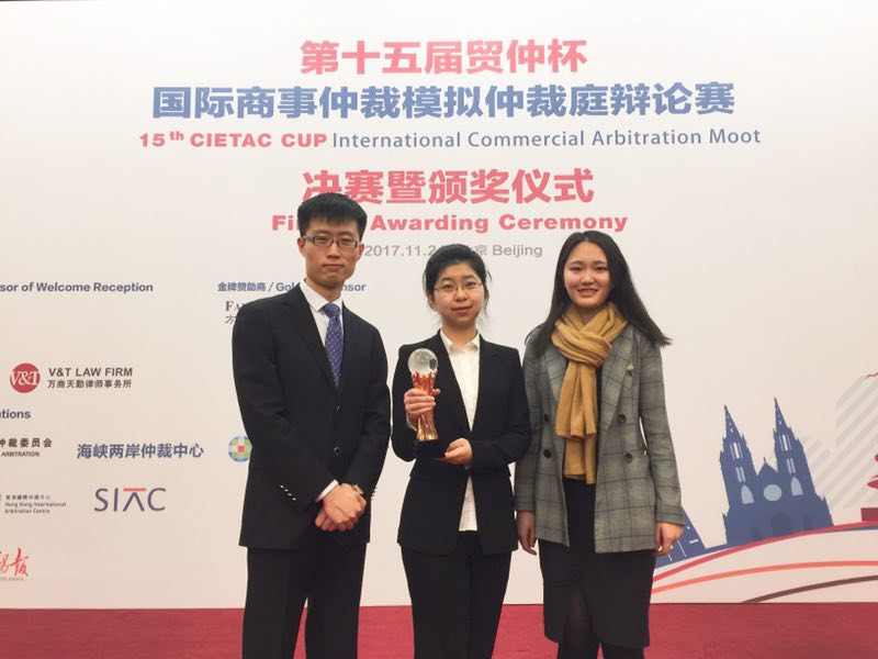2017年11月20日至24日,第十五届“贸仲杯”国际商事仲裁模拟仲裁庭辩论赛(以下简称“贸仲杯”)在北京国际商会大厦举行。经过五天激烈角逐,中国政法大学代表队夺得季军。我校队员李佳珂获得循环赛“最佳辩手”称号,杨昆波获得赛队“突出贡献奖”称号。