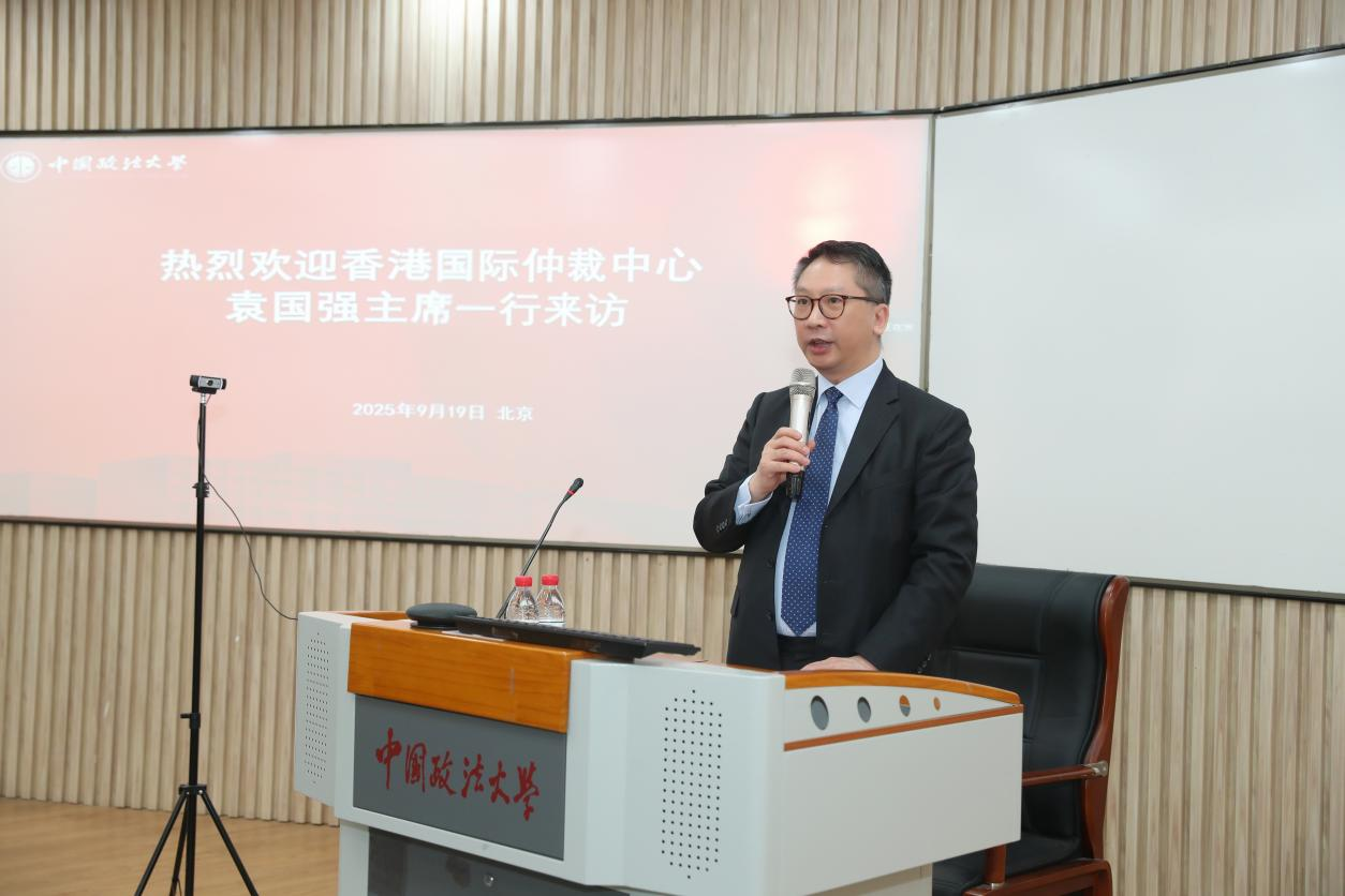 /涉外法治学院全体师生对袁国强主席一行表示热烈欢迎和诚挚感谢。他指出,此次香港国际仲裁中心专家团队的到来,为法大师生提供了与国际仲裁实务前沿直接对话的珍贵机会。他期待袁国强主席的精彩授课将为同学们带来启发,并通过本系列课程,进一步推动我校涉外仲裁人才的培养。